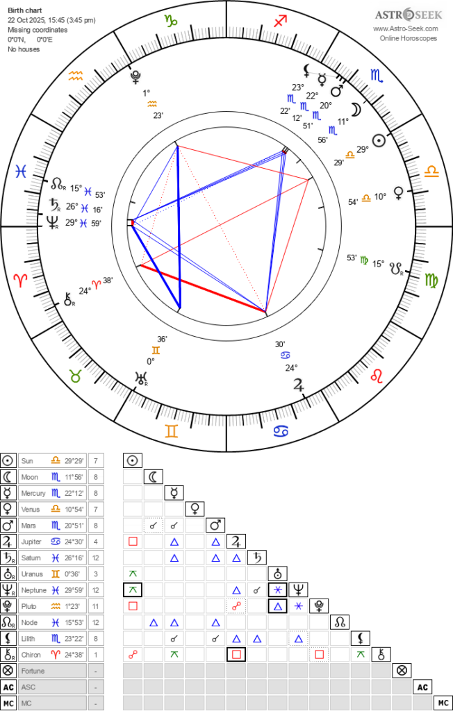 The sky of October 22, 2025 is ruled entirely by the invisible elements Water and Air. There is no Fire, no Earth, leaving the heavens suspended, fluid, and intangible