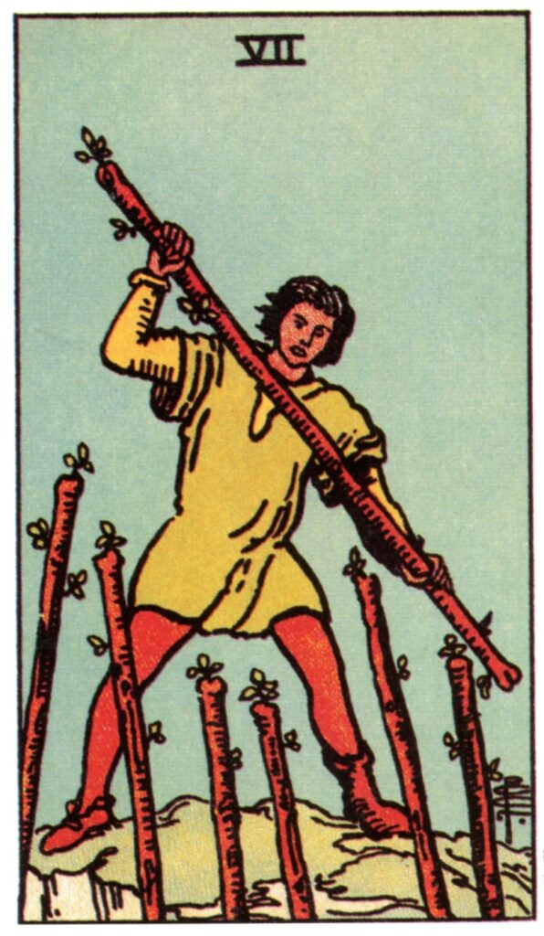 Right on the Ascendant there is a conjunction of Mars and Venus applying to the degree. Mars is the planet closest to the Ascendant and, in addition, it has dignity by term. This makes Mars the main significator of vitality, strength and fighting capacity in this chart. In this case, Mars is actually an accidental benefic. It works as a shield. It is the planet that defends the native’s own life, supports self-assertion and gives a very strong capacity for resistance, struggle and perseverance. In the Tarot, Mars in Leo corresponds to the Seven of Wands, which is precisely the image of defensive strength and stubborn resistance. This native fights for what he wants, fights to keep what he conquers, and does not give up his position easily.
