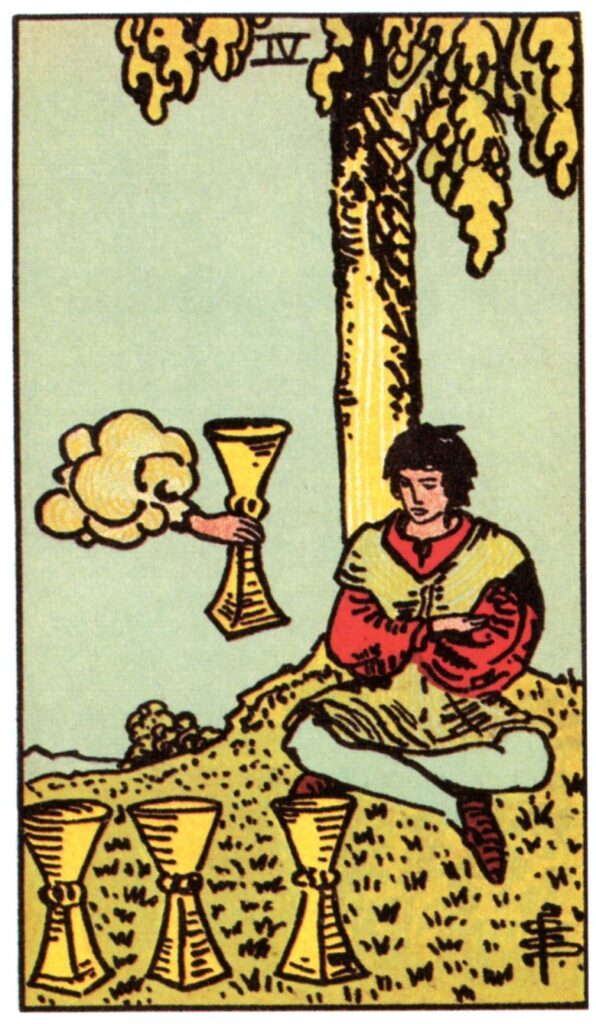 In the Minor Arcana, the four always brings the cardinal decan of the element to completion. The first three decans belong to the cardinal sign, the second three to the fixed sign, and the third three to the mutable sign. Thus, 4, 7 and 10 are cards that seal ternaries, stages that close a movement and consolidate a force. The 4 of Cups is Moon in Cancer, the point at which Cardinal Water gathers the impulse initiated by the Ace and inscribes it into its matrix.