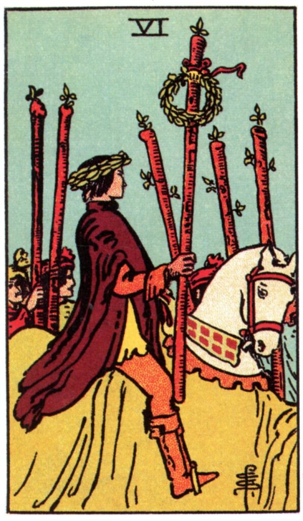 The Six of Wands teaches that the Divine Light does not abandon the physical plane; it hides within it until recognised. The fire of Atziluth continues to burn through the ashes of experience. In this sense, Victory is the quiet endurance of meaning within matter. The card is the witness that the Word still breathes through the dust.