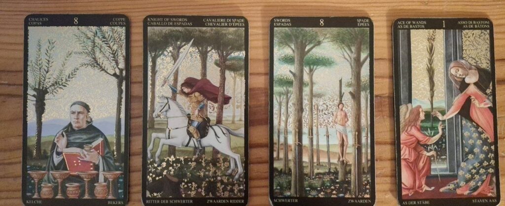 And how does he feel? We have the 8 of Swords. Again the 8, the Tarot is telling us something. He is trapped in his own mind, analysing the best course of action. Jupiter in Gemini has the harmful tendency to expand every possible mental path and option. It is Jupiter in detriment, operating in a sign contrary to its nature. As soon as one path seems certain, this 8 of Swords appears to question: is there not a better one? And that one? And the other? This suggests that the man feels mentally divided between several options forward. Even if the affair appears brief and fleeting to him, he is not entirely certain that committing fully to his wife is the right choice, particularly given the double presence of the number 8. It is mercurial Hod twice over, mental whirlwinds that leave him uncertain. Even the shape of the 8 itself points to an eternal loop from which he does not seem capable of freeing himself.