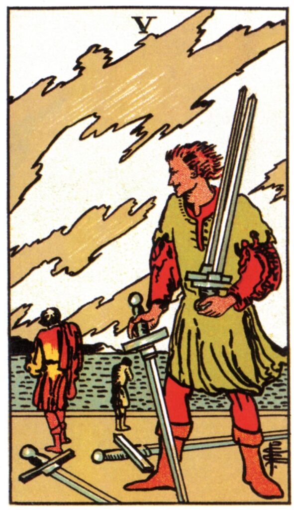 The Tarot handed me the 5 of Swords. Well, of course. Swords, the element of Air. The matter at hands is intellectual, prone to discussion, opinions, arguments. Then you have the 5 there, which points to the martial Geburah in the Tree of Life. Again, arguments, but this time with an aggressive, quarelling tone. And the 5 of Swords is Venus in Aquarius, so the planet of love entangled in a fixed, sanguinine sign. Venus enamored with long debates (fixed signs are slow), with endless blabbering, with the chance of winning arguments and someone ending up ‘happy’ with a Phyrric victory.
