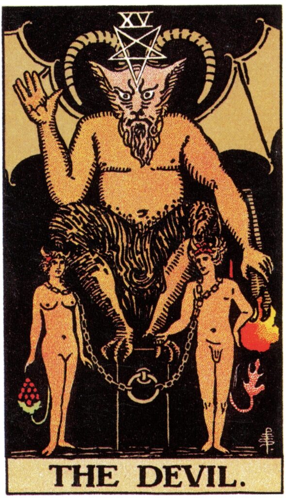 To allow the set to end, to release it, to let it ascend without chasing after it: that is what breaks the false chains. Liberation does not lie in escape, but in consenting to the measure of the cosmos. It is no coincidence that, in the Tarot, the fifteenth Arcanum – The Devil – is associated with Capricorn, and once again with matter. In the most familiar representation of the card, the Devil binds the two poles – the masculine and the feminine – which in God are one and androgynous, but in flesh are divided. It is the reversal of The Lovers, where it is the Angel who sanctifies their union. Here there is disunion. The inverted pentagram points to the triumph of matter over Spirit.