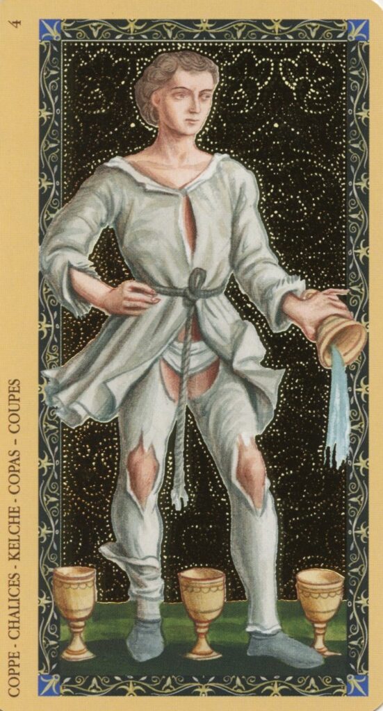 Now in the decan of the Moon, corresponding to the Four of Cups, Jupiter reflects this soft fatigue of abundance. In the Kabbalistic world of Briah, Chesed manifests through reflection and rest. The heart swells with gratitude, but its edges blur under the weight of feeling. Jupiter, currently angular at the Nadir, guards the roots of existence; he presides over the digestion of cosmic memory. The spiritual rain he pours is slow and interior. Through him, heaven remembers the first sea that once covered the earth.