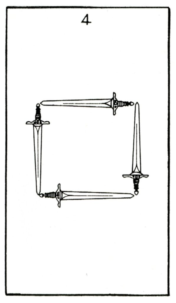 This decan is tied in the Tarot to the Four of Swords. It reflects the expansive current of Jupiter held within a fixed pattern of four blades, forming a square that belongs to the element of Air. The image expresses measured extension, thought brought to rest.